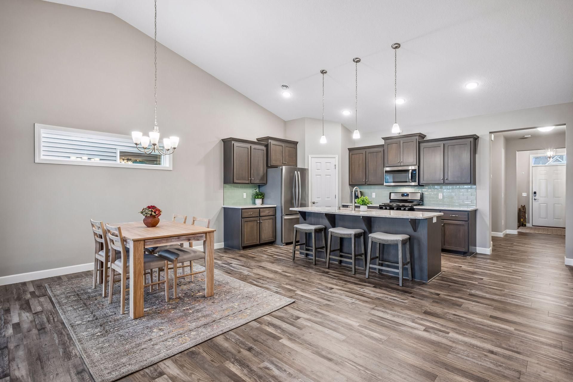 Well-maintained and move-in ready, this one-level home offers a functional layout and quality finishes. Featuring 3 bedrooms and 2 bathrooms, the home is designed for comfortable everyday living with the ease of association-maintained care. Inside, you'll find 9-foot and vaulted ceilings, abundant natural light, and durable luxury vinyl plank flooring throughout. The open kitchen is a standout with quartz countertops, tile backsplash, gas range, center island with pendant lighting, and a walk-in pantry. Ideal for both daily use and entertaining. The living room is anchored by a cozy corner gas fireplace, while a separate sunroom provides a bright, relaxing space with access to the patio. Perfect for enjoying morning light or quiet evenings. The primary suite features a walk-in closet with built-in storage and a private bath with dual sinks, cultured marble countertops, and a spacious walk-in shower. Two additional bedrooms and a full bath offer flexibility for guests, work-from-home space, or hobbies. A separate bonus room adds even more versatility for storage, crafts, or a home office. Additional highlights include a dedicated laundry room, excellent storage throughout, two-car garage with ceiling-mounted storage racks and a newer roof (2023). Enjoy the convenience of numerous smart home features. Walking paths and nearby amenities add to the appeal of this well-cared-for property. Optional: sold fully furnished.