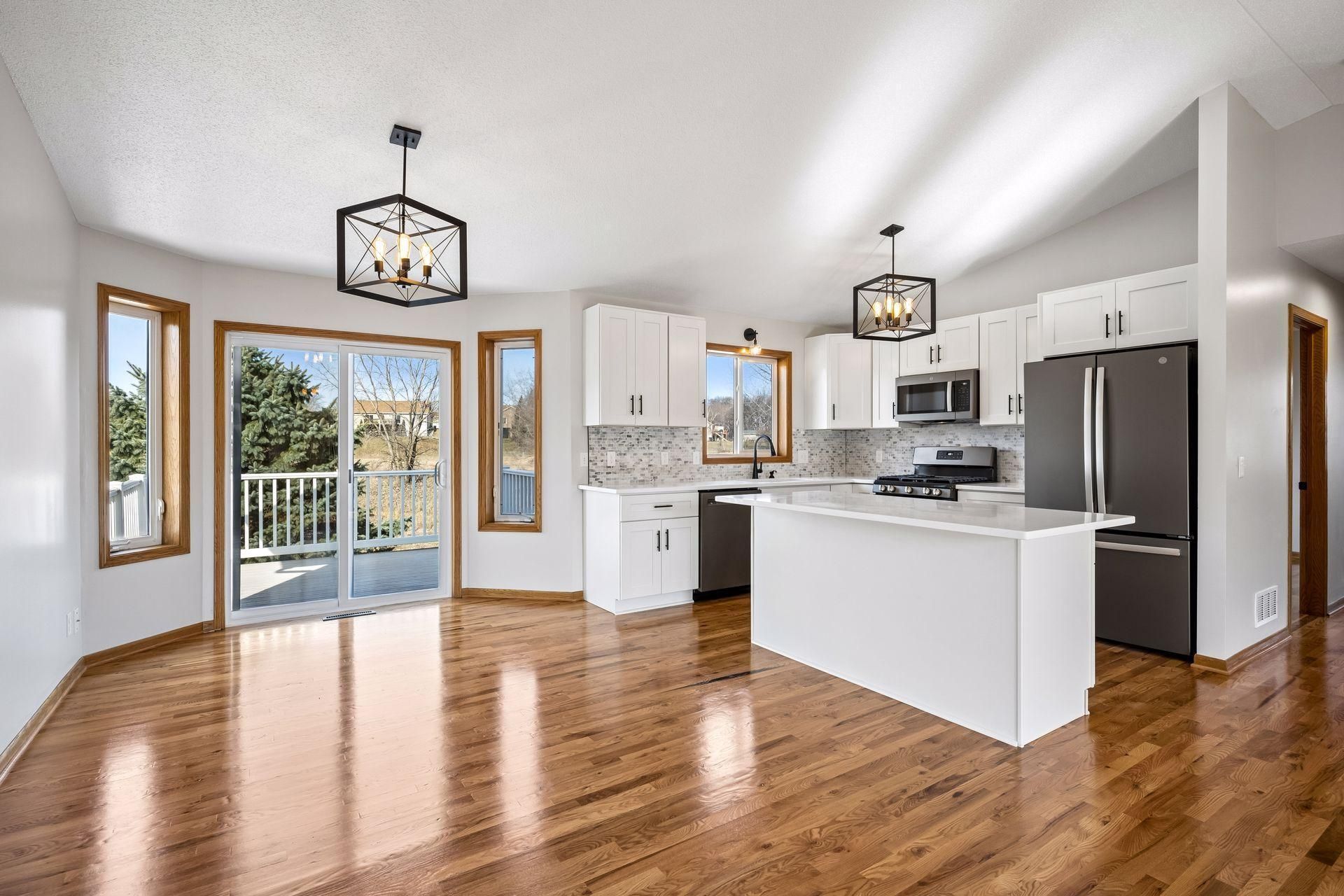 Beautifully remodeled home in a convenient location. The upper level features vaulted ceilings and gleaming hardwood floors throughout, along with a brand-new kitchen complete with quartz countertops and stainless steel appliances. The dining area opens to a back deck overlooking River Mill Park. The lower level offers a spacious living room, a third bedroom and second full updated bathroom. Enjoy new carpet and fresh paint throughout the home. A generous three-car garage provides ample storage and parking. Conveniently located just minutes from amenities, parks, trails, and major highways?schedule your showing today